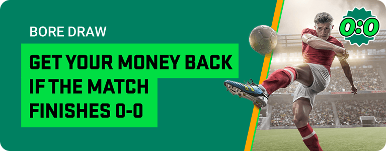 There’s nothing worse than an Bore Draw. That’s why we are giving you your stake back as cash on selected markets if the match finishes 0-0.